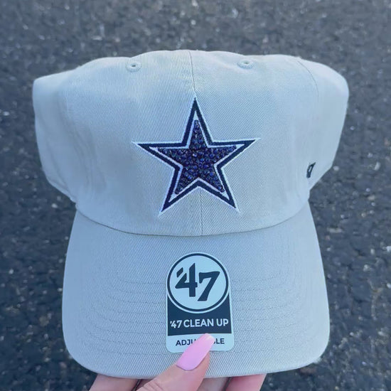 The Cowboys adjustable hat has been customized with gorgeous crystals. Each crystal is carefully hand placed with a variety of different sizes to give it the ultimate shine! Crystals are set in place with permanent adhesive.